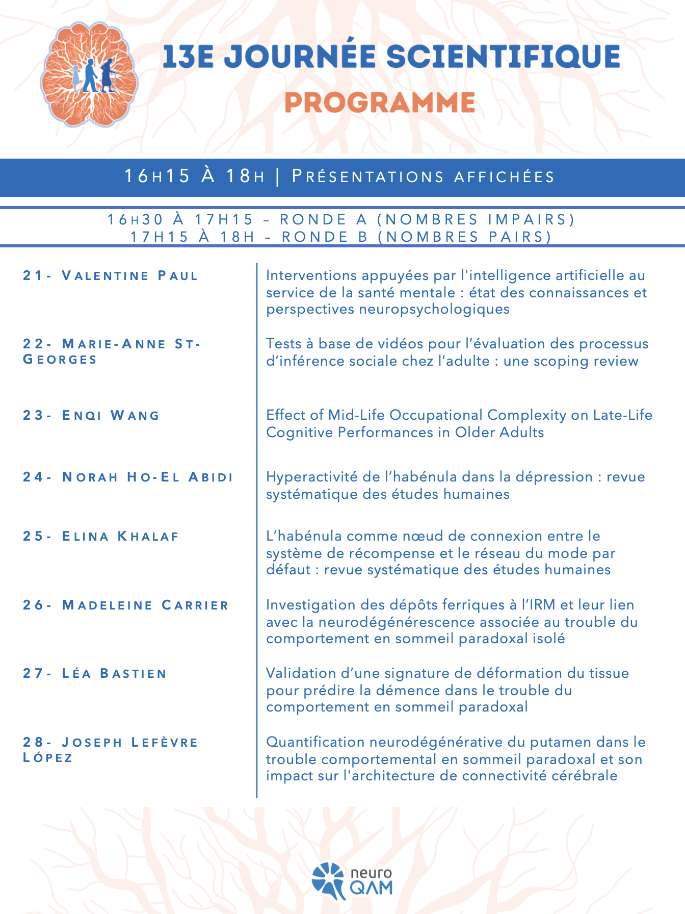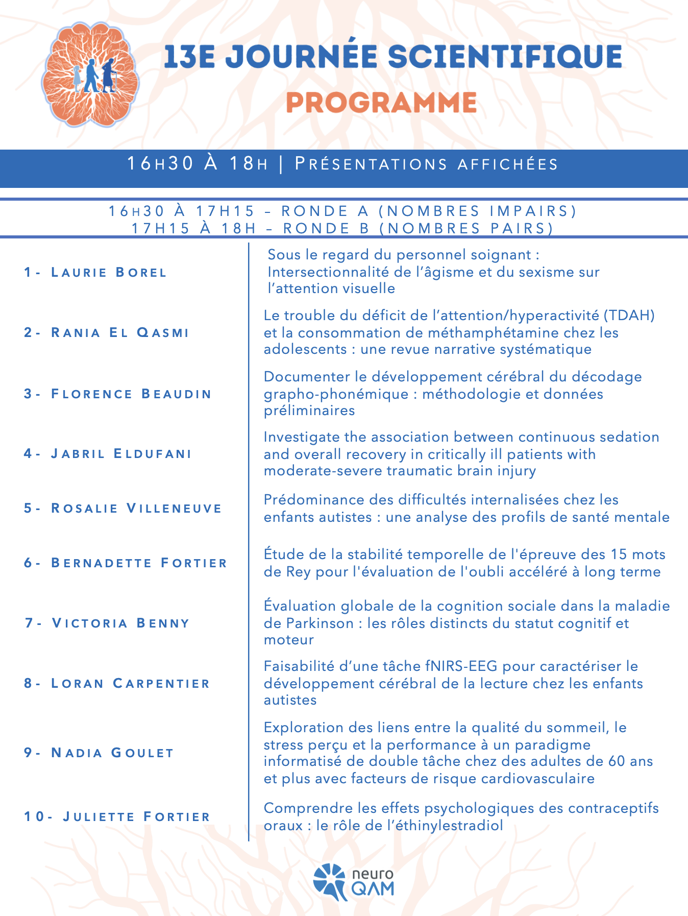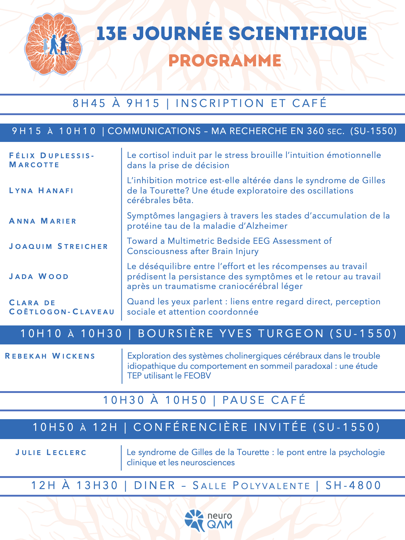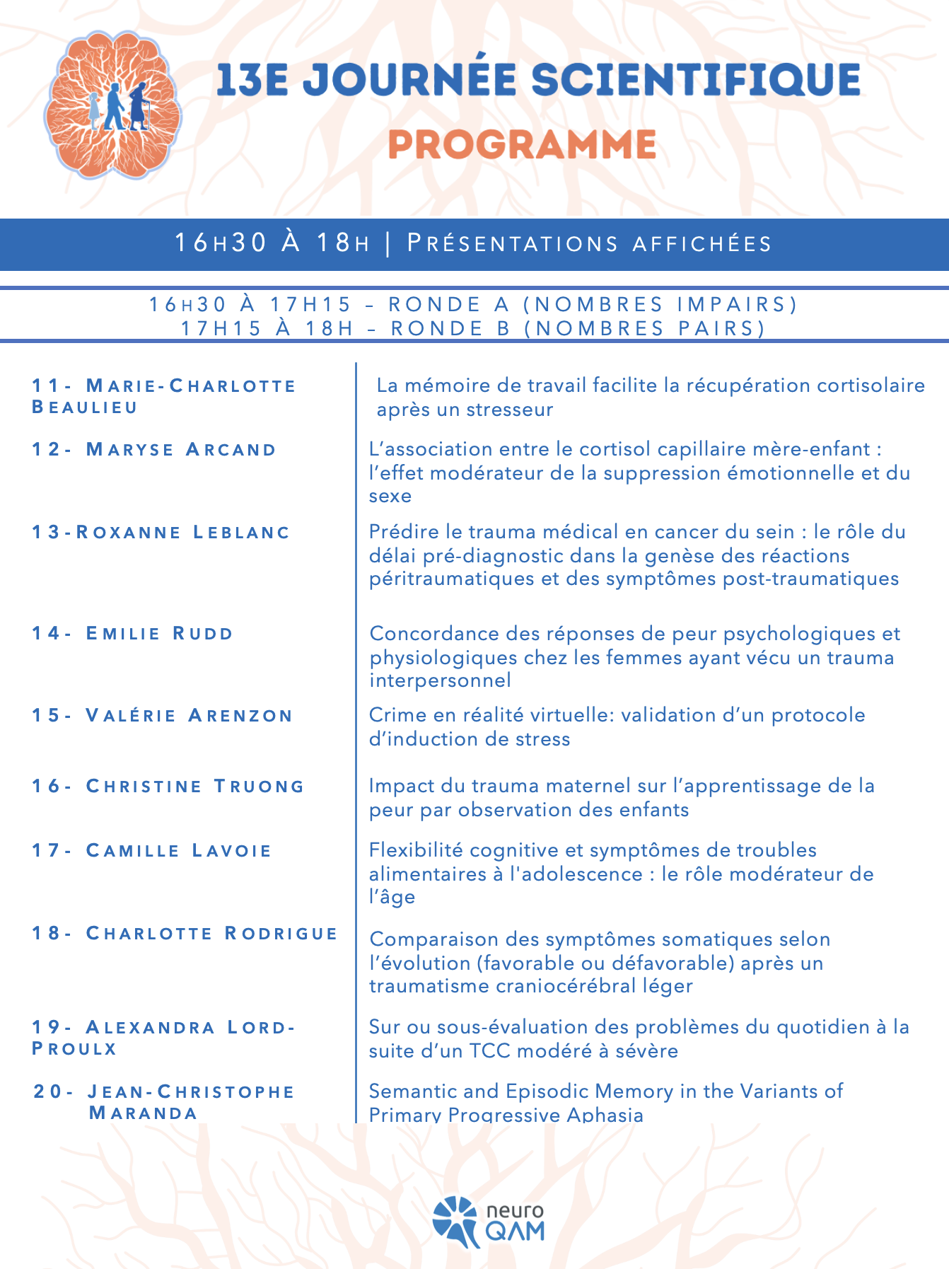 Cette présentation sera un survol de différentes études, allant d’une enquête sur la perception de la réussite éducative des jeunes ayant le SGT, à des essais cliniques randomisés visant à évaluer l’effet de psychothérapies appuyées de mesures biopsychosociales.